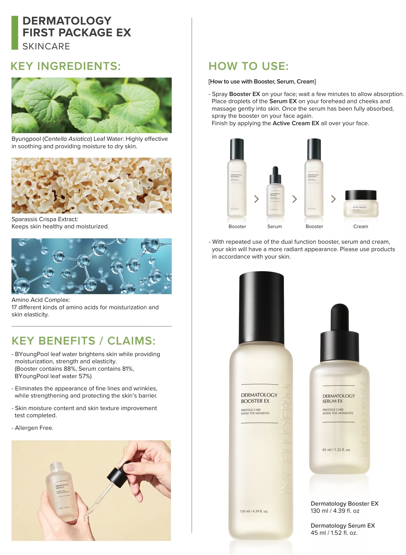 Booster & serum work synergistically to protect the skin from environmental stressors while providing deep nourishment, for healthy and bright skin. High concentration of Giant BYoungPool leaf water (Booster contains 88%, Serum 81%), plant-based extracts, and proprietary complexes provide for a highly functional, dermatologically effective system.